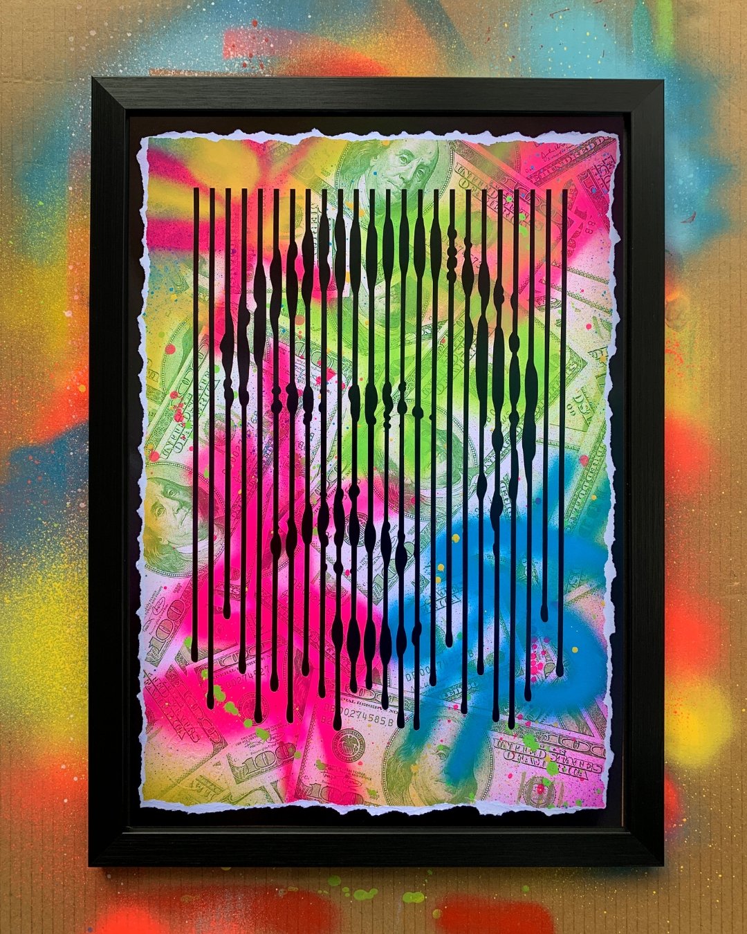 This one of a kind, original piece is a multicoloured sprayed stencil on American dollar bill printed card, presented in an A3 glass frame. This is the actual cut stencil, backed onto black card.